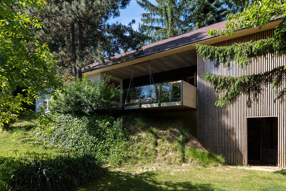 Az építkezés három évig tartott, az alapot a kis családi ház képezte, amelyet még építész-technikus édesanyám építtetett a kettőnk részére, és két kis garzonból állt. Azt mondta, hogy fiam, ha majd egyszer családod lesz, akkor az egyik irányban bővítheted a házat. És ez így is történt, mikor a párommal úgy döntöttünk, hogy ez a helyszín ideális lesz Piliscsabán, a dombtetőn a családalapításra. Az egyik kis garzon konyhájából hálószoba lett, a hozzáépített részben pedig egyterű konyha-nappali rész kapott helyet, amihez kapcsolódik egy előtér és egy kamra. Ennek kiegészítéseként épült meg a garázst, műhelyt és az irodámat befoglaló épülettömeg, amely a többi résztől eltérően cseréplécekkel határolt. A burkolat kézműves jellegét a lécek hosszában történt elfelezése adta. Kifelé a lécek vágott fele került, amely így kívülről kicsit hullámzó hatást kelt. A háznak erre a részére, ahol a számomra kialakított helyiségek helyezkednek el, nem kerültek nyílászárók, mivel nem akartam ablakot, ahol a közeli szomszédság be tud nézni, viszont a lécek átmenetet képeznek a teljes nyitás és zárás között, bentről csak dekorálják a kilátást, kívülről sokkal zártabbnak tűnnek. Így kellő intimitást kaptak a terek, a tetőtérben lévő irodámban az íróasztal előtt 2 méterrel helyezkedik el a lécsor, és szép kilátás nyílik a környékre. Az irodám üvegkabinnal van elválasztva a garázs-műhely terétől, asztalmagasságig cementtel burkolva.