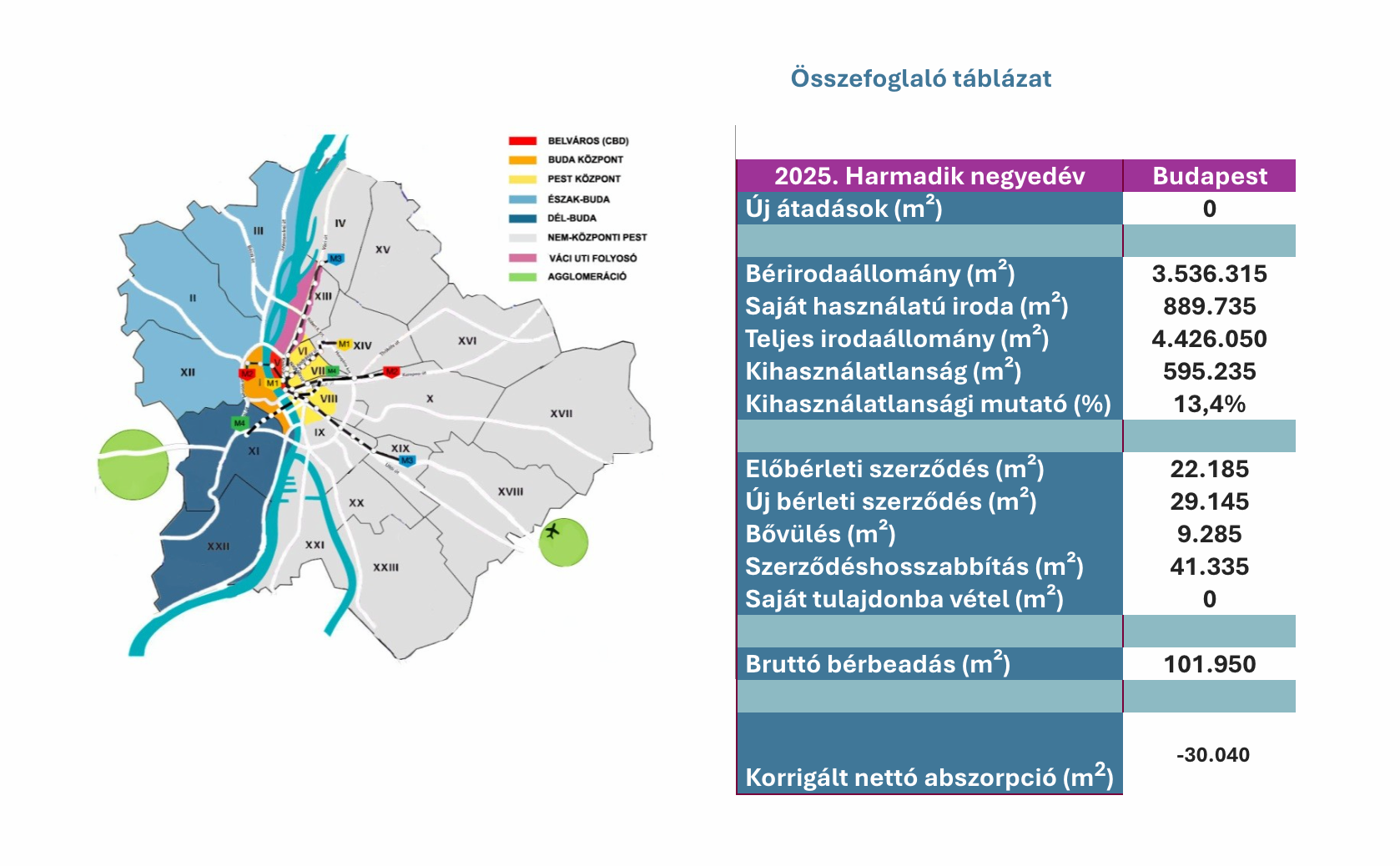 2025 harmadik negyedévében nem került sor új modern irodaterület átadására Budapesten, így a teljes irodaállomány változatlan maradt az előző negyedévhez képest.