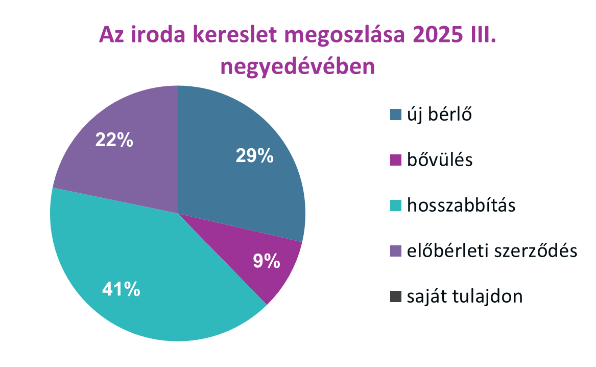 A teljes kereslet 2025 harmadik negyedévében 101.950 négyzetmétert tett ki, amely az előző év azonos időszakához képest 9%-os növekedést jelent. A teljes keresleten belül a szerződéshosszabbítások 41%-os részesedéssel bírtak. Az új szerződések a bérbeadások 29%-át tették ki, míg a bővülések mindössze 9%-ot. Egy előbérleti szerződést regisztráltunk, ami 22%-át teszi ki a teljes keresletnek.